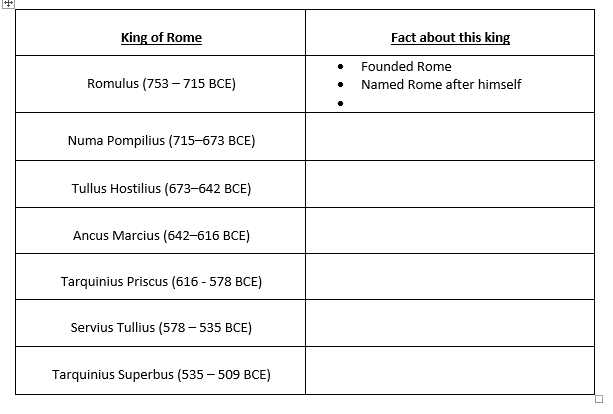 Today’s task is to find out a bit more about the seven kings of Rome. Copy (or print, if preferred) the table below and then research and try to add at least one fact about each.